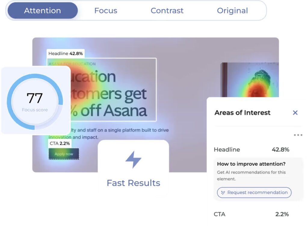 Upload ad creative before spending budget. The platform predicts which elements will grab attention in your target format. This works for display ads, social media creative, and packaging design.